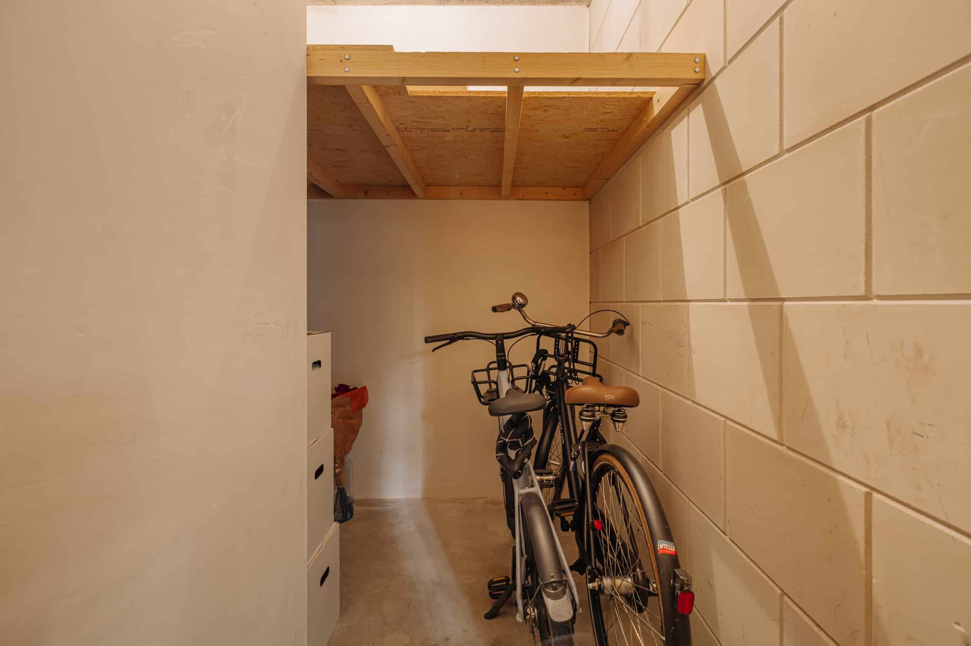 The ground floor of the building features a private storage unit for this apartment, and a secured common bicycle garage on the HOA’s own land.