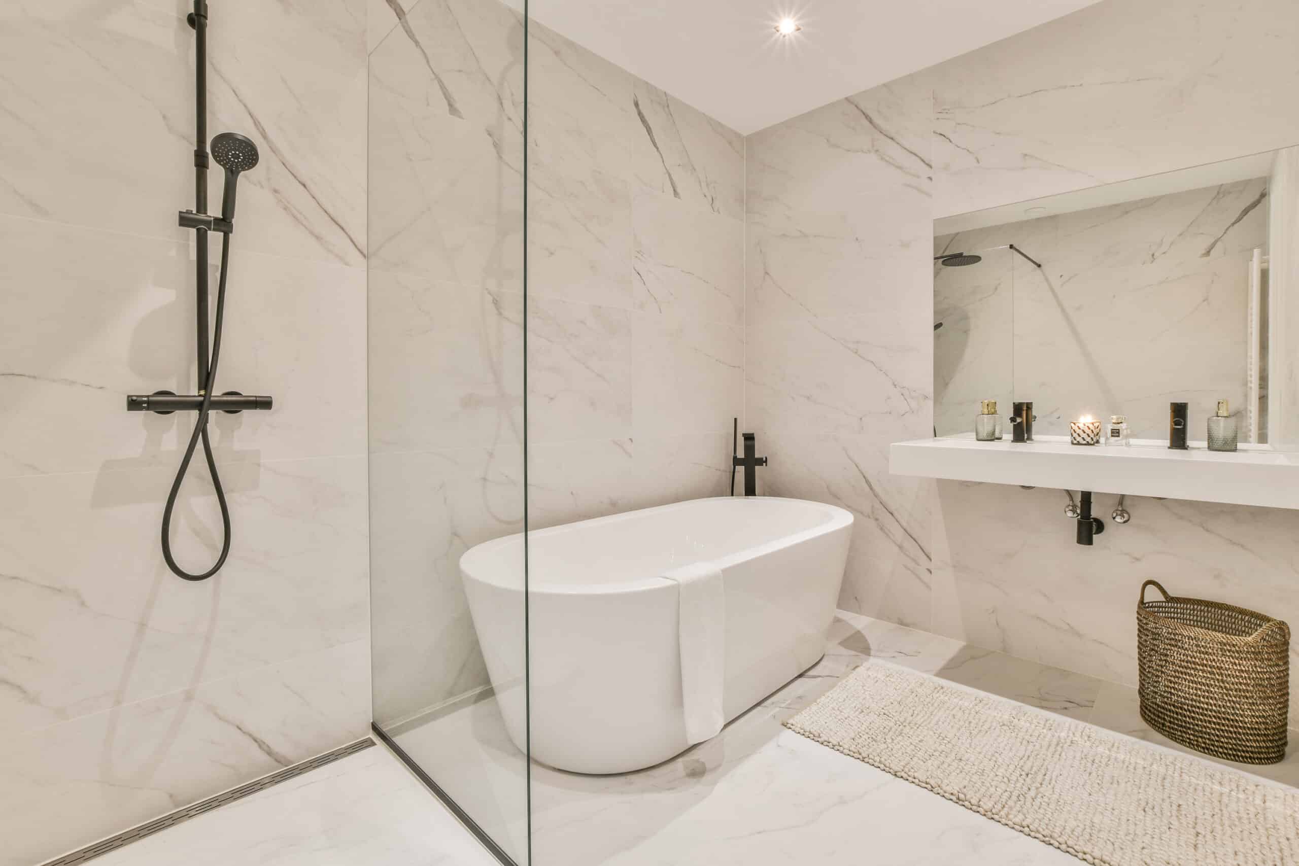 The luxury bathroom is centrally positioned and showcases elegant, light faux marble tiling. The bathroom is equipped with a free-standing bathtub, rain shower and a double vanity. As a modern contrast to classic marble, the robust black taps and shower lend the bathroom contemporary opulence.