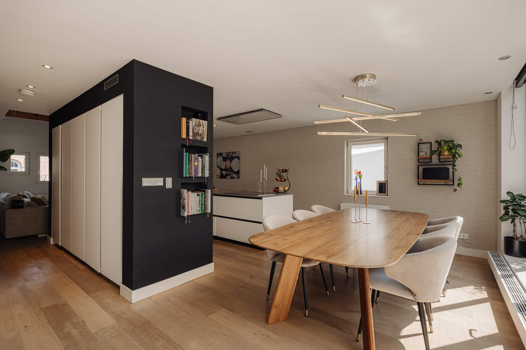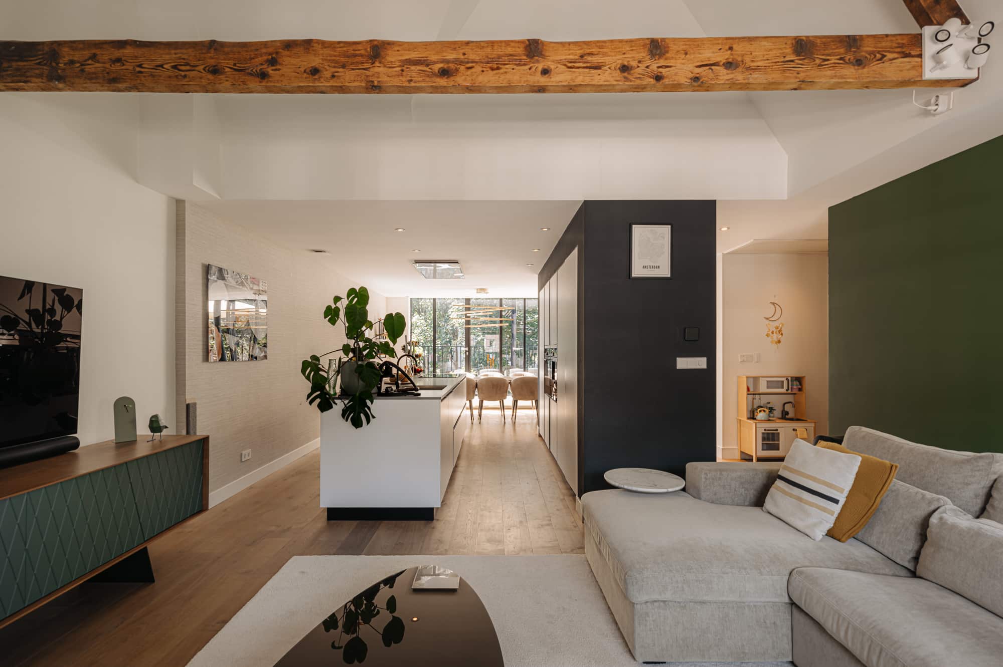 The sitting area at the front showcases an incredibly high ceiling: 5.2 meters tall. Below the roof structure is a large insulated storage space, which also accommodates the central heating unit. The soaring ceiling, combined with the exposed beams lend the space an inviting loft-like ambiance.