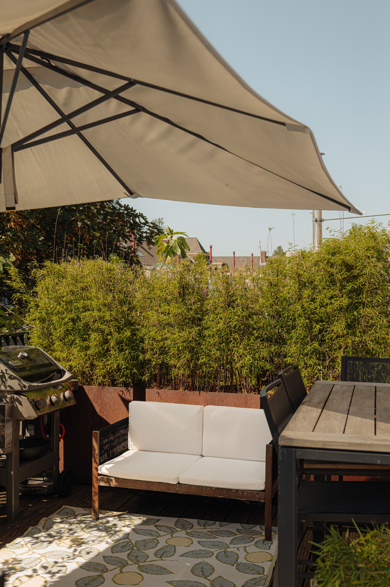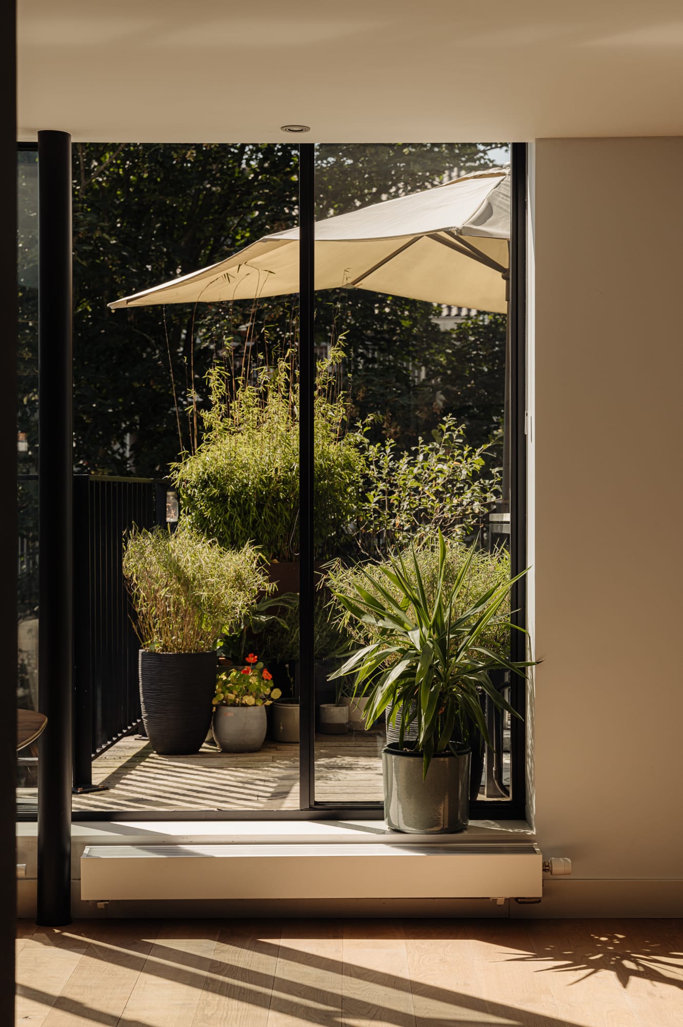 The home’s living space is on the third floor. You’ll be amazed at the abundance of light that welcomes you as soon as you walk in, flooding in through the large window that spans the full width of the living room. The open kitchen with a chef’s island is fitted with a range of modern appliances, including an induction cooktop, combination oven (Siemens), dishwasher, coffee machine (Siemens) and a refrigerator and freezer. The kitchen opens directly to the outdoor space, so there’s no hassle and no need to carry your plates and food up and down the stairs to the roof deck! This is the ultimate in outdoor living, a fantastic spot to enjoy all day long.