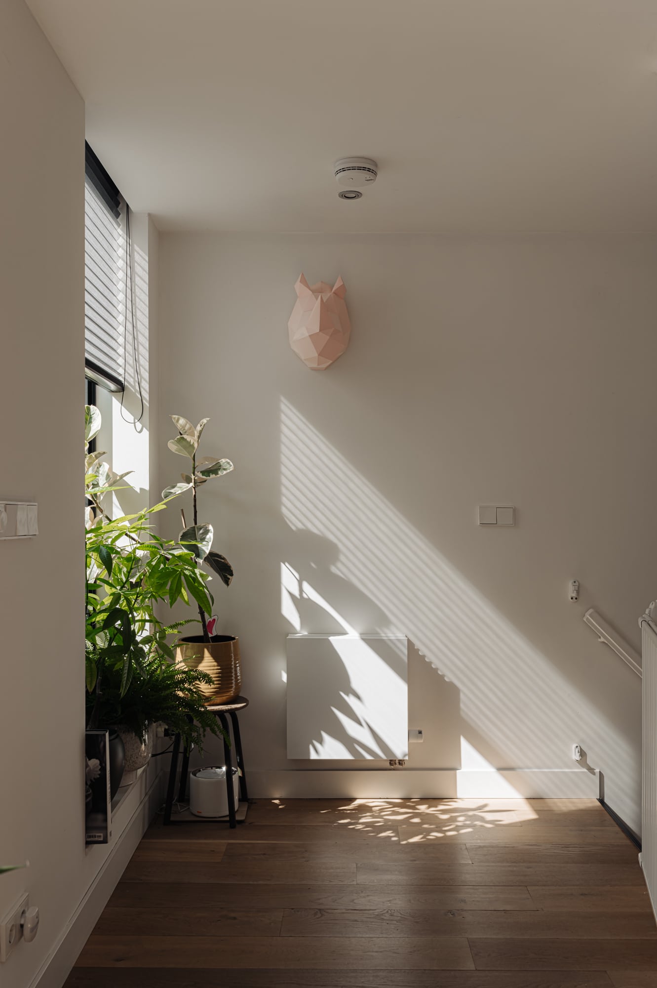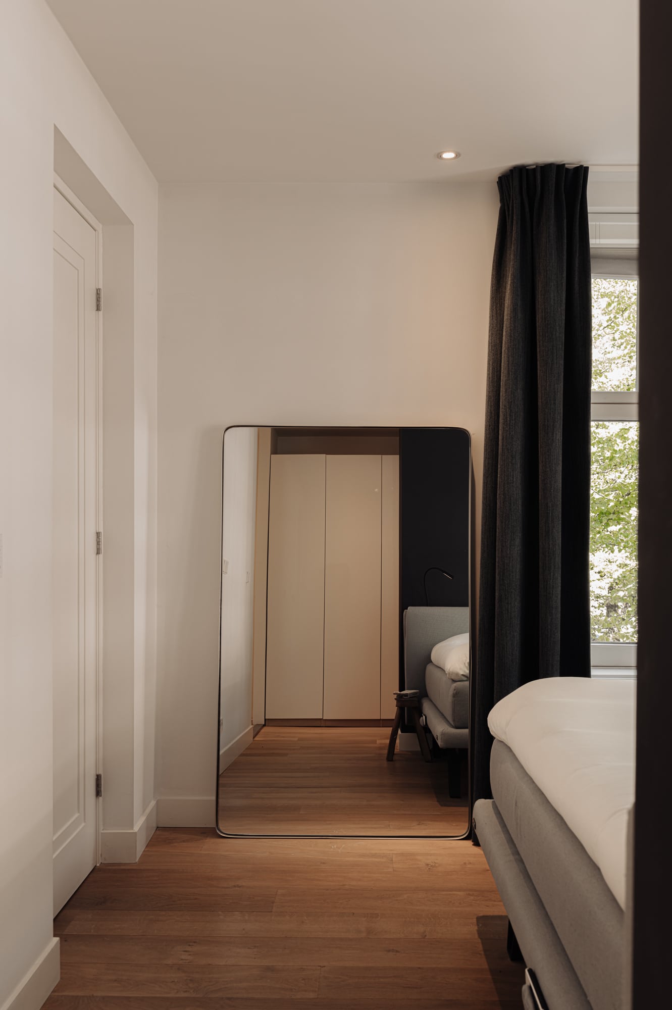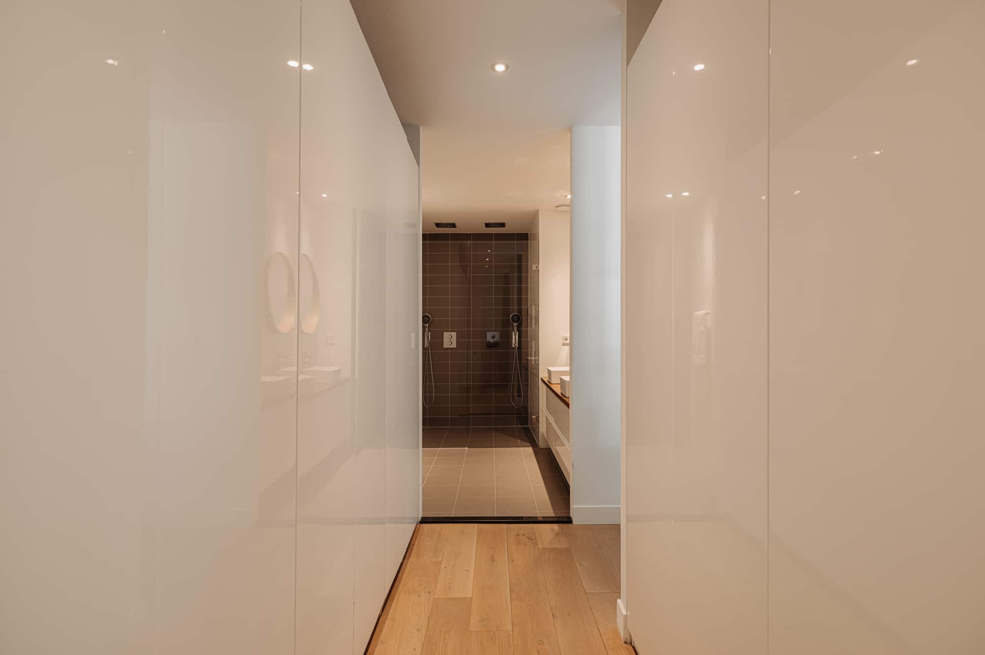 The private entrance on the first floor leads to the apartment on the second floor. This is the ‘bedroom’ level, with no less than four (bed)rooms and two bathrooms. The primary bedroom at the front features a large fitted wardrobe wall and a connecting bathroom with a double vanity and generous walk-in shower with two rain showers. The second bedroom at the front is currently appointed as a nursery. The other two bedrooms are at the rear, both open to sunny balconies of 4 sqm (W) each. There is more storage space off the corridor, as well as a laundry room, a separate restroom and access to the second bathroom with a sink and a walk-in shower.