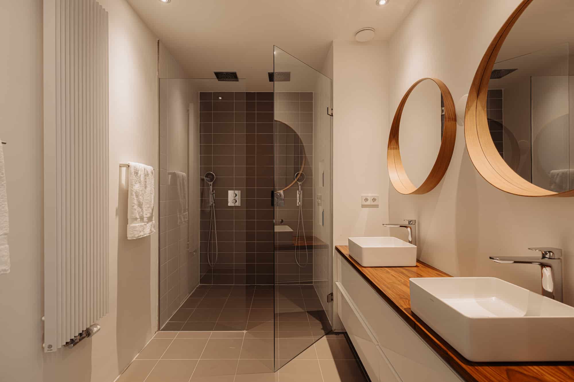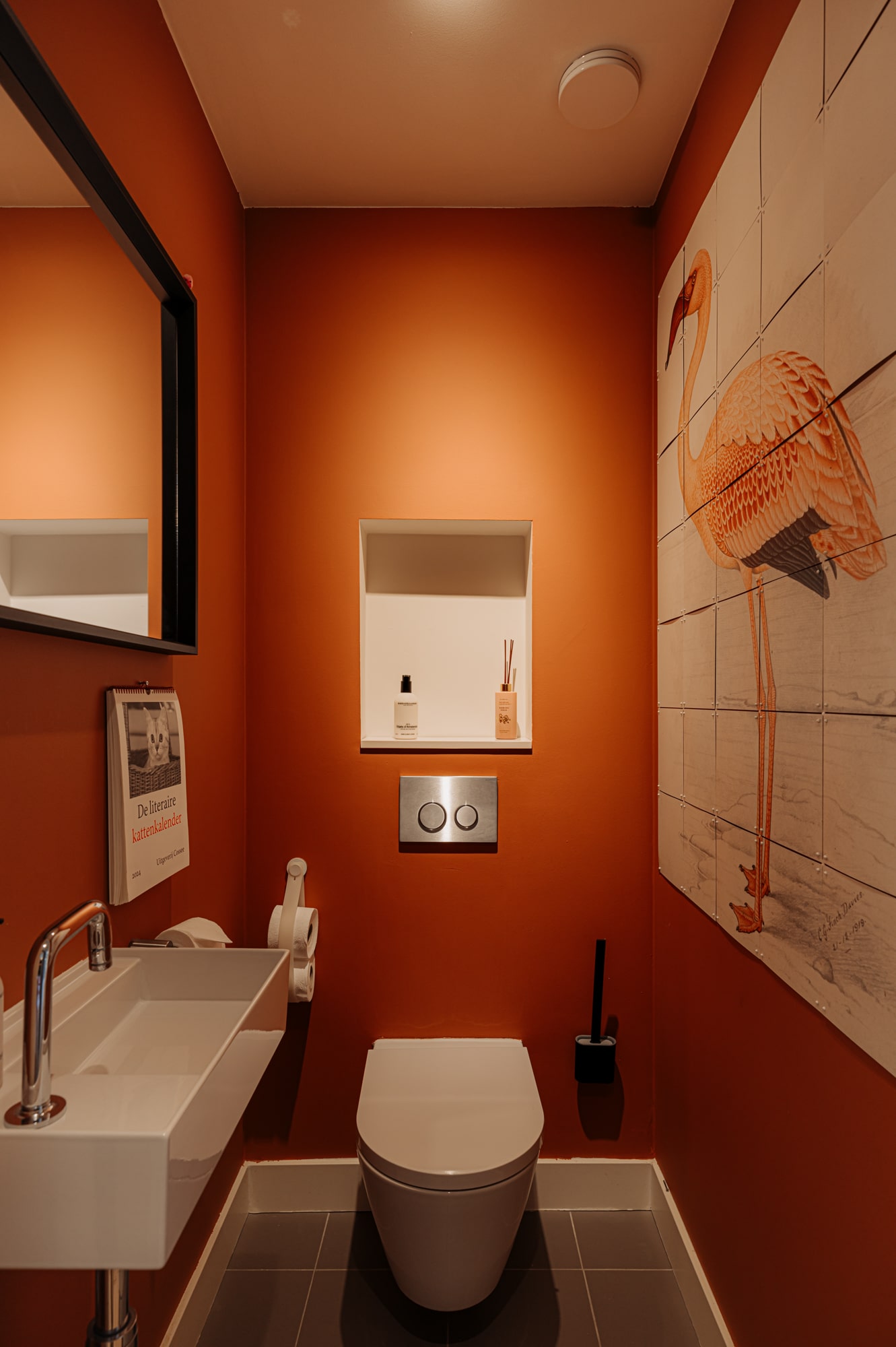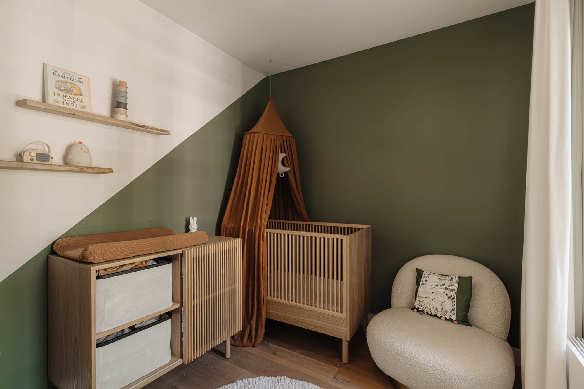 The private entrance on the first floor leads to the apartment on the second floor. This is the ‘bedroom’ level, with no less than four (bed)rooms and two bathrooms. The primary bedroom at the front features a large fitted wardrobe wall and a connecting bathroom with a double vanity and generous walk-in shower with two rain showers. The second bedroom at the front is currently appointed as a nursery. The other two bedrooms are at the rear, both open to sunny balconies of 4 sqm (W) each. There is more storage space off the corridor, as well as a laundry room, a separate restroom and access to the second bathroom with a sink and a walk-in shower.
