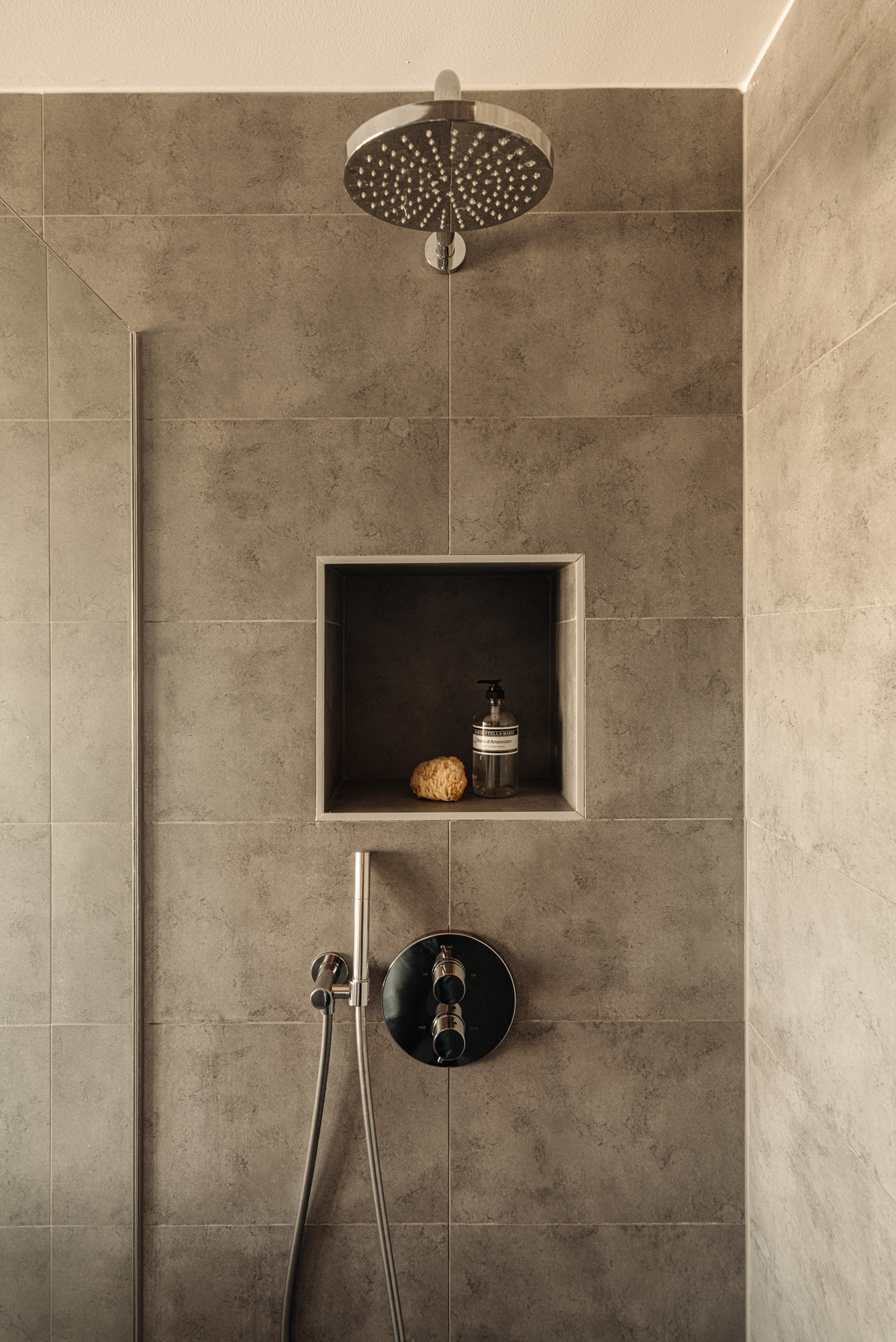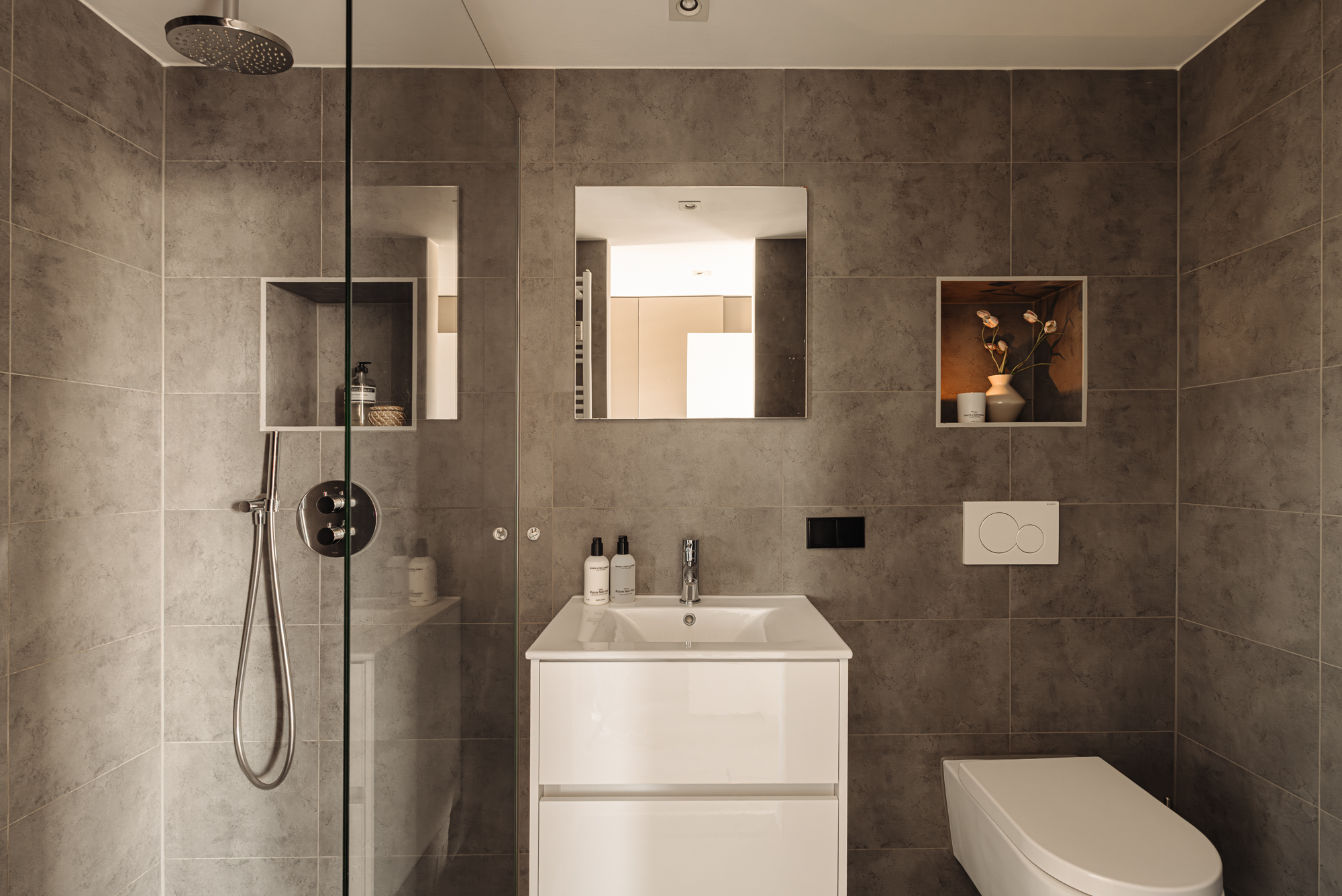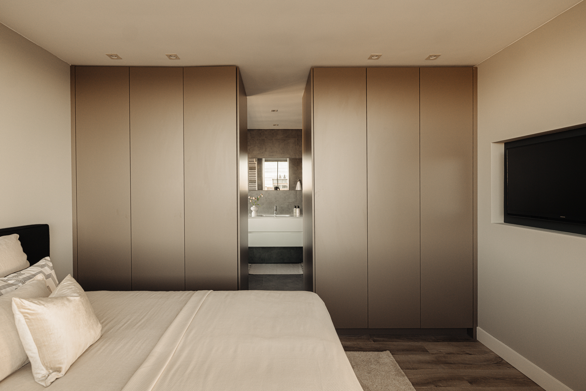 The open-plan kitchen is sleekly designed and fitted with all necessary built-in appliances. Located behind the kitchen is the master bedroom: a spacious room featuring luxurious, custom-made built-in wardrobes and an en-suite bathroom. This bathroom is fitted with a bathtub offering both views and privacy, a walk-in shower and a washbasin unit.