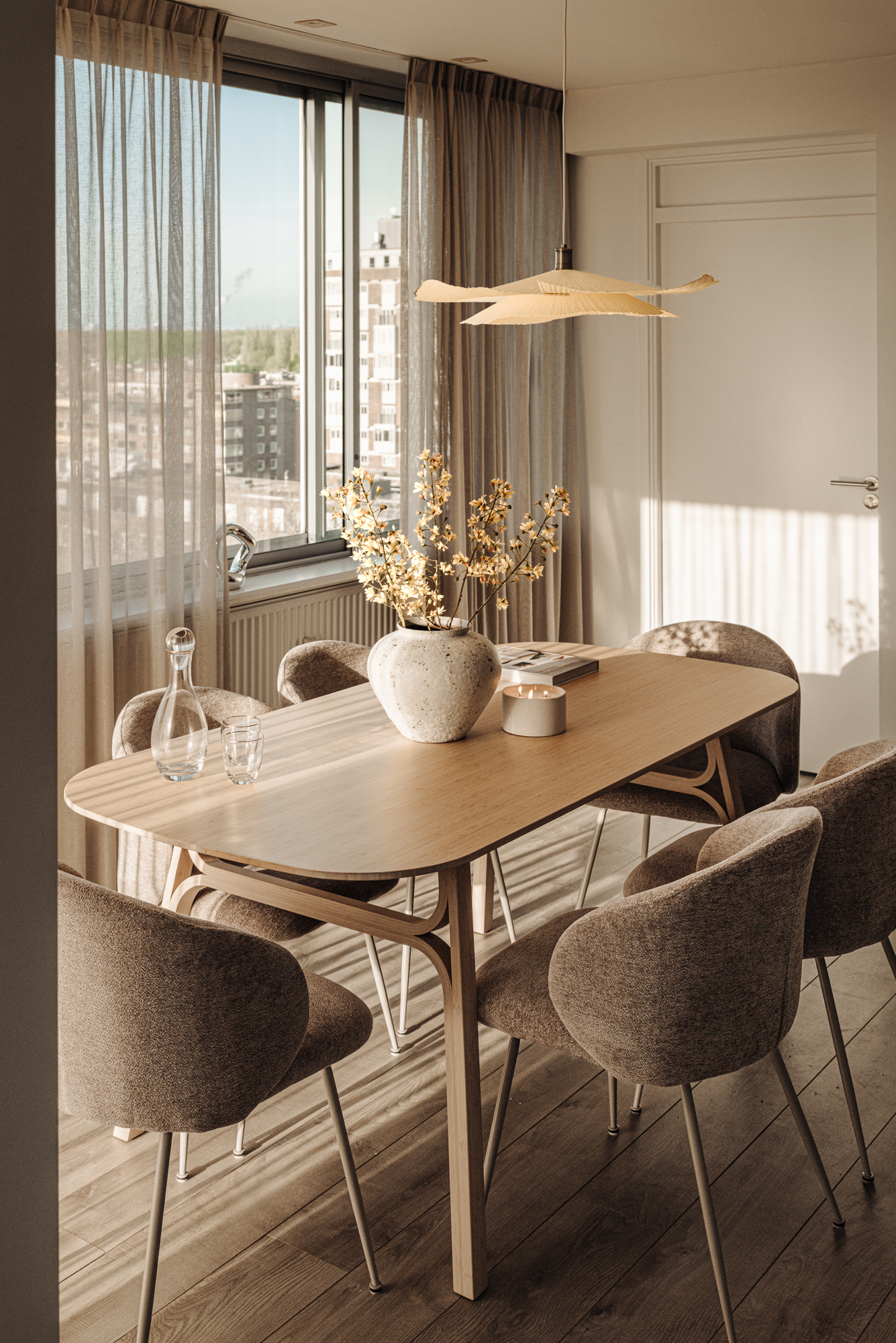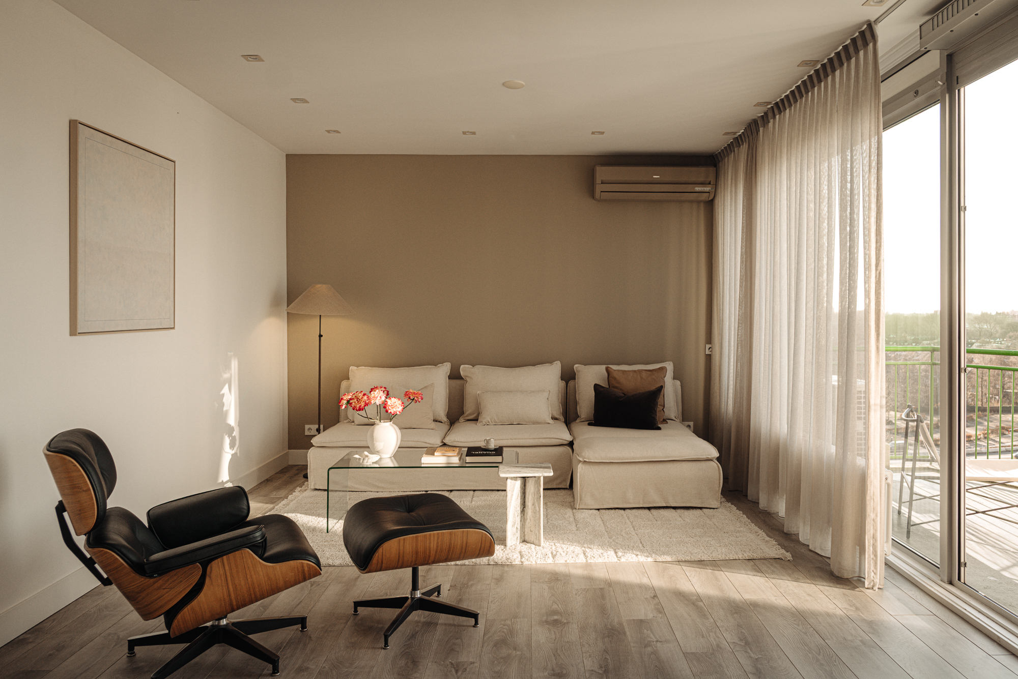 All rooms are accessible from the entrance hall. The spacious living room forms the heart of the apartment and is characterized by large windows, its corner position and panoramic views. There is ample space for both a comfortable seating area and a generous dining table, both enjoying city views.