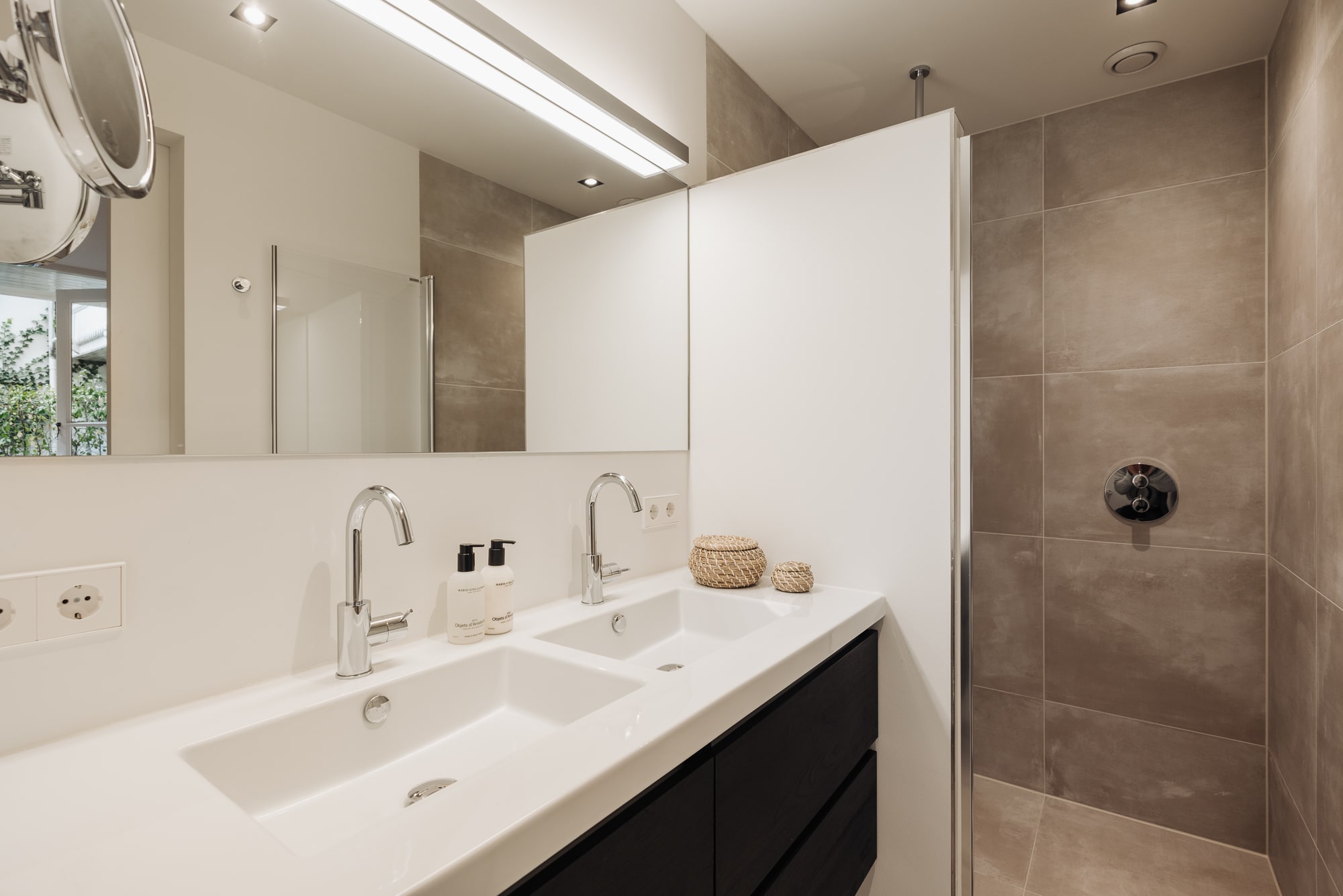 The grand wooden staircase leads to the landing on the 1st floor. At the front is the modern bathroom with a stand-alone bathtub, walk-in shower, vanity, toilet and of course comfortable underfloor heating.