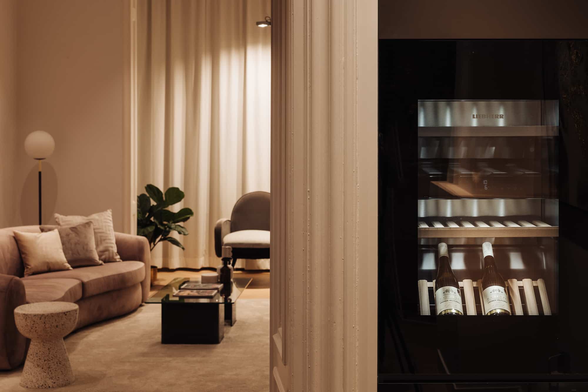 Private front door to the foyer and hall, showcasing the original marble flooring. Elegant living space with pocket doors and a stunning crowned ceiling of approx. 3.50m tall – contributing to the ambiance and spacious feel. At the front, the luxury kitchen with a chef’s island is fully-equipped with high-end appliances, including warming drawers and a wine refrigerator. The chef’s island features an integrated tall table – the perfect spot for drinks and dinner. The living is exceptionally bright, due to the charming bay at the rear. The marble fireplace mantel and wooden flooring are the finishing touch of this exquisite space.