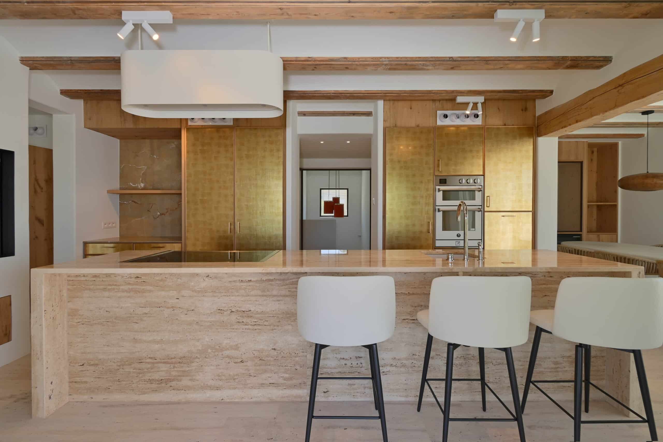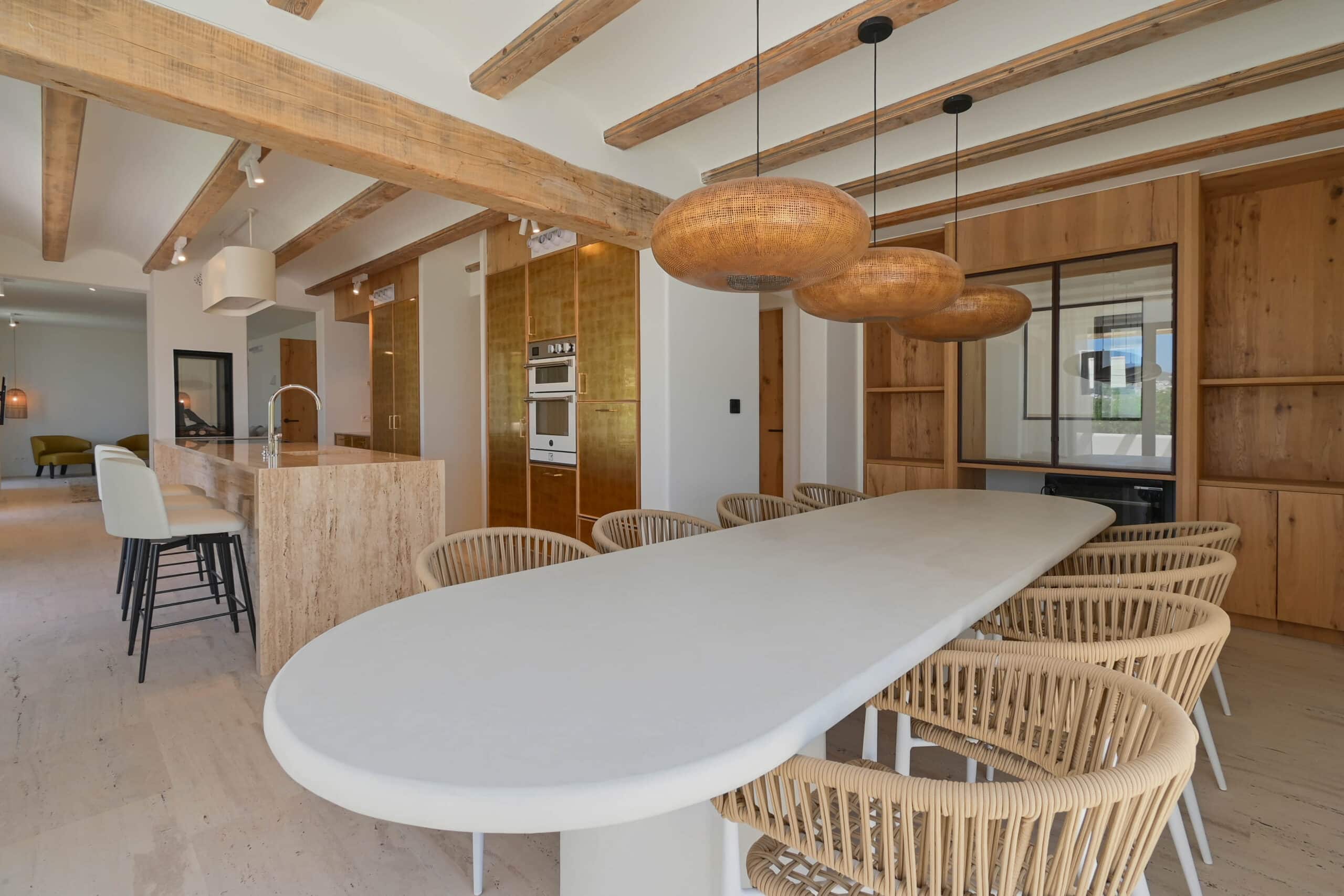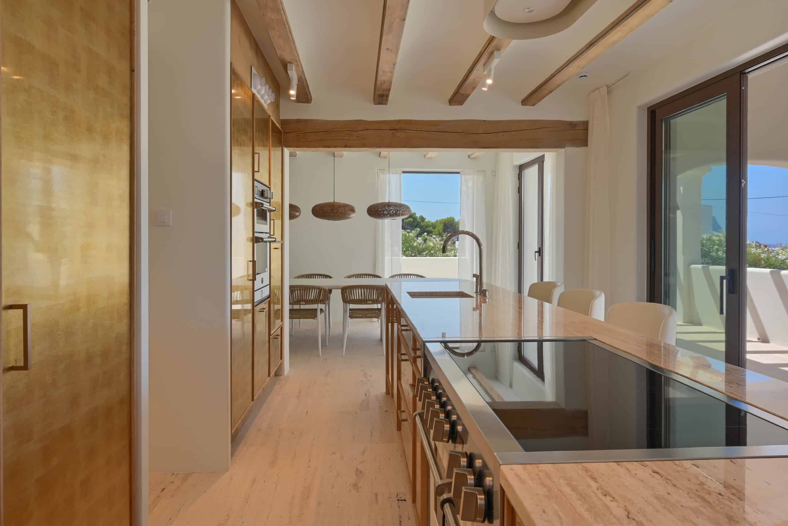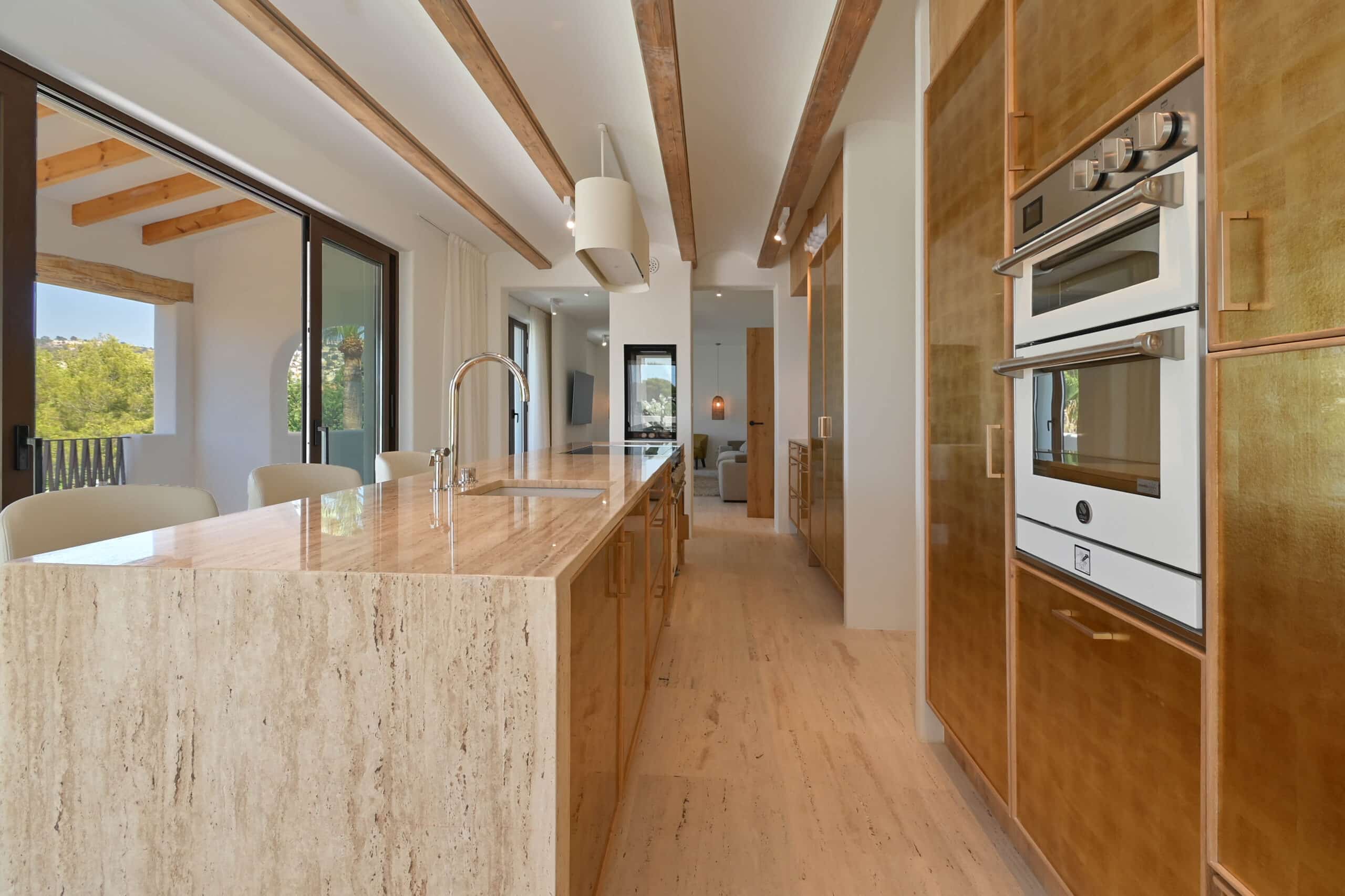 Het hart van het huis is een prachtig ontworpen, volledig ingerichte keuken die functionaliteit combineert met tijdloze elegantie. Met luxe travertijn aanrechtbladen in combinatie met vergeten Spaans marmer en ultramoderne apparatuur is deze ruimte perfect voor zowel culinaire creaties als entertainment. Naast de showcase keuken heeft u ook de beschikking over een volledig ingerichte voorbereidingskeuken – gelegen net naast de eethoek voor naadloos entertainment.