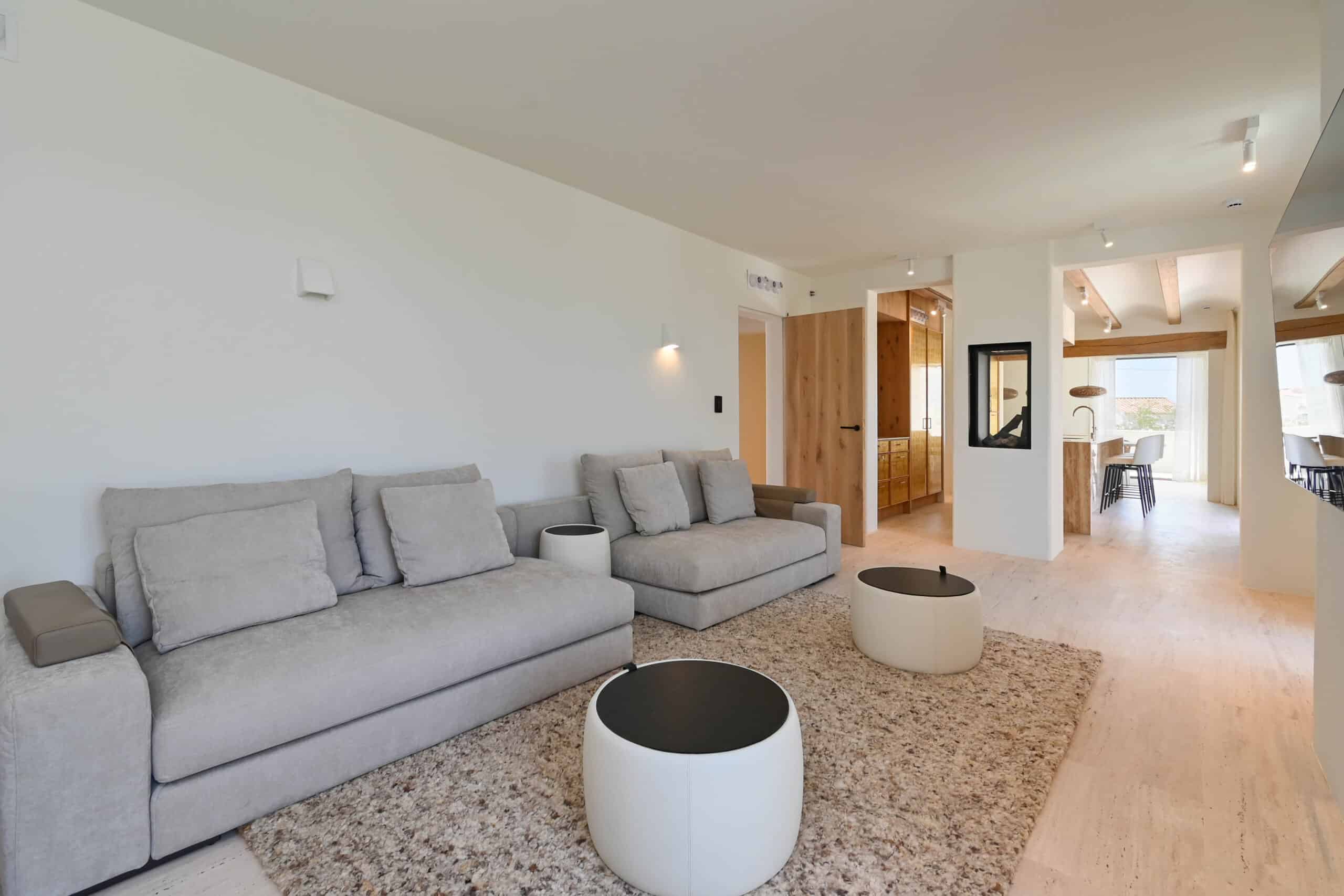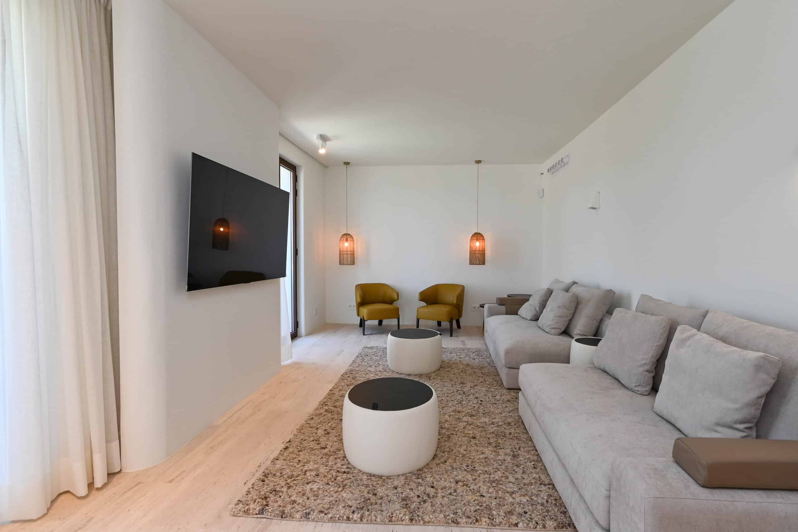 De prachtige woonkamer, gelegen op de eerste verdieping, loopt naadloos over in een buitenterras en een privébalkon, waardoor een idyllische setting ontstaat voor al fresco dineren tegen een achtergrond van adembenemende uitzichten op de kust. Verder heeft u toegang tot het solarium dat meer mogelijkheden biedt voor zitplaatsen of entertainment.