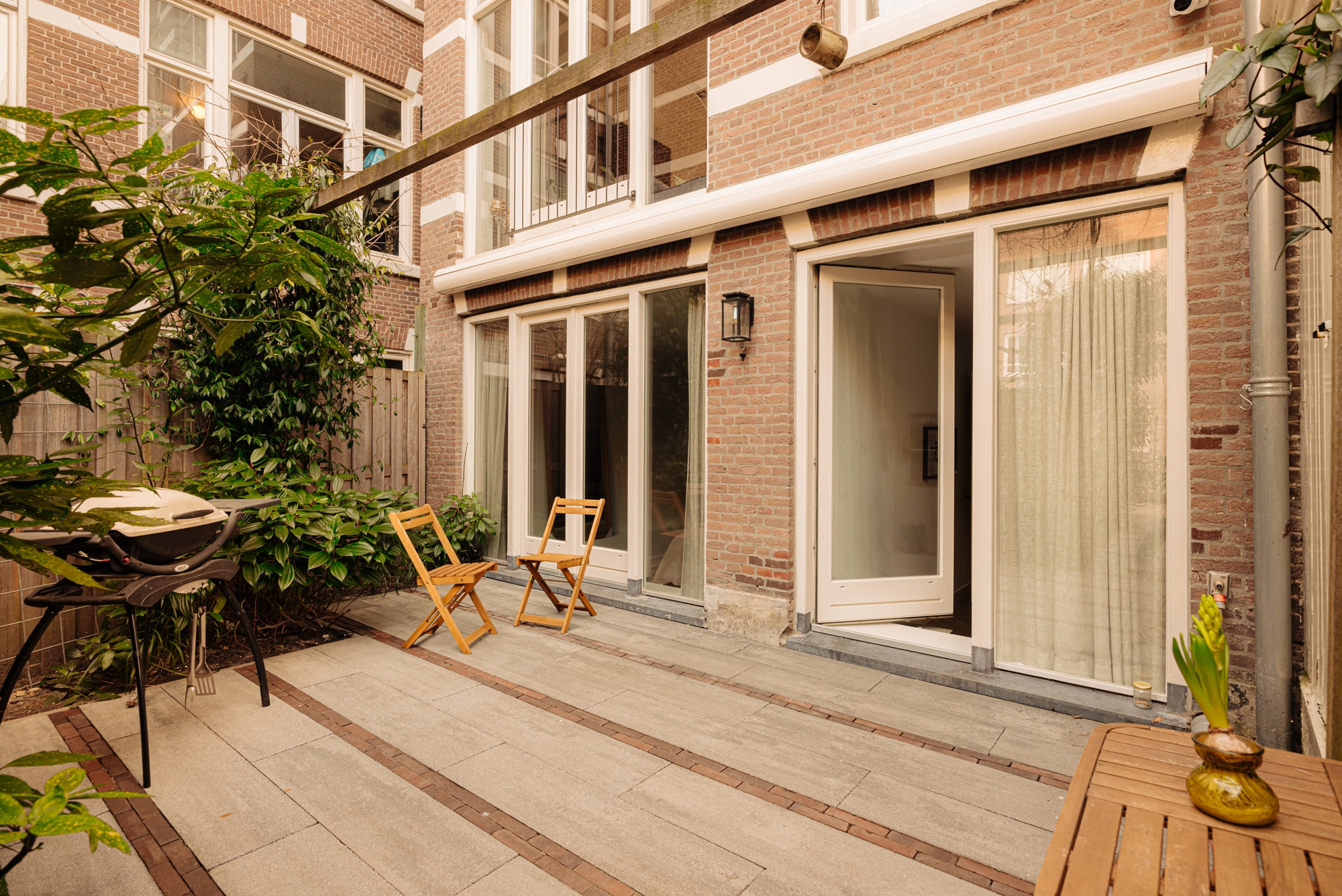 De woning heeft een verzorgde achtertuin, bereikbaar via de slaapkamers aan de achterzijde. De tuin heeft een afsluitbare achterom, ideaal voor het veilig stallen van fietsen, en komt uit op een rustig en charmant pleintje.