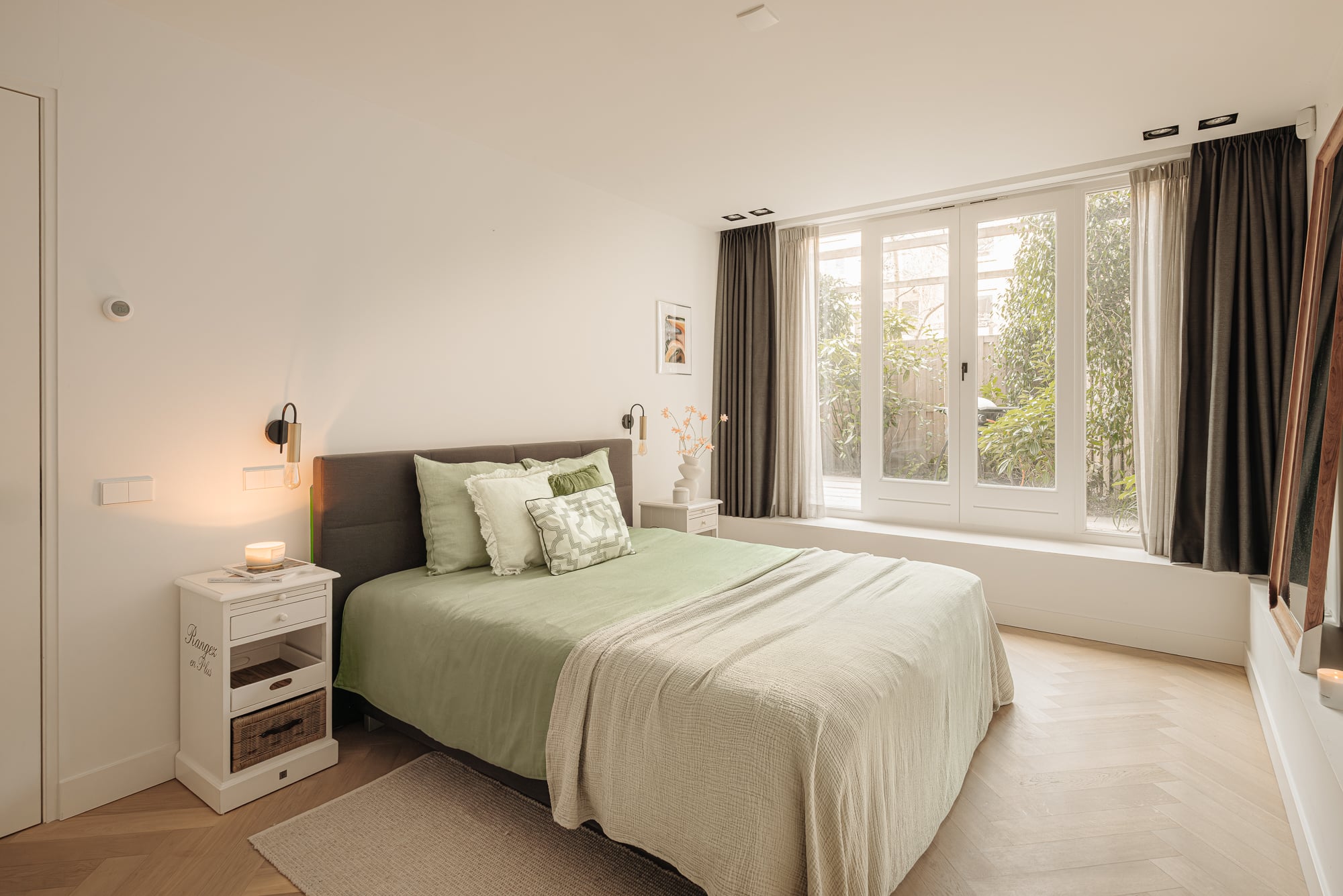 Een brede trap met inbouwspots leidt naar het souterrain met een plafondhoogte van 2,60 meter, voorzien van vloerverwarming. Deze verdieping biedt 3 (slaap)kamers, waarvan twee ruime slaapkamers met beide strak ingebouwde kastenwanden. Een van de slaapkamers heeft openslaande deuren naar de tuin. De extra kamer is perfect als werkruimte, kinderkamer of logeerkamer en biedt eveneens toegang tot de tuin.