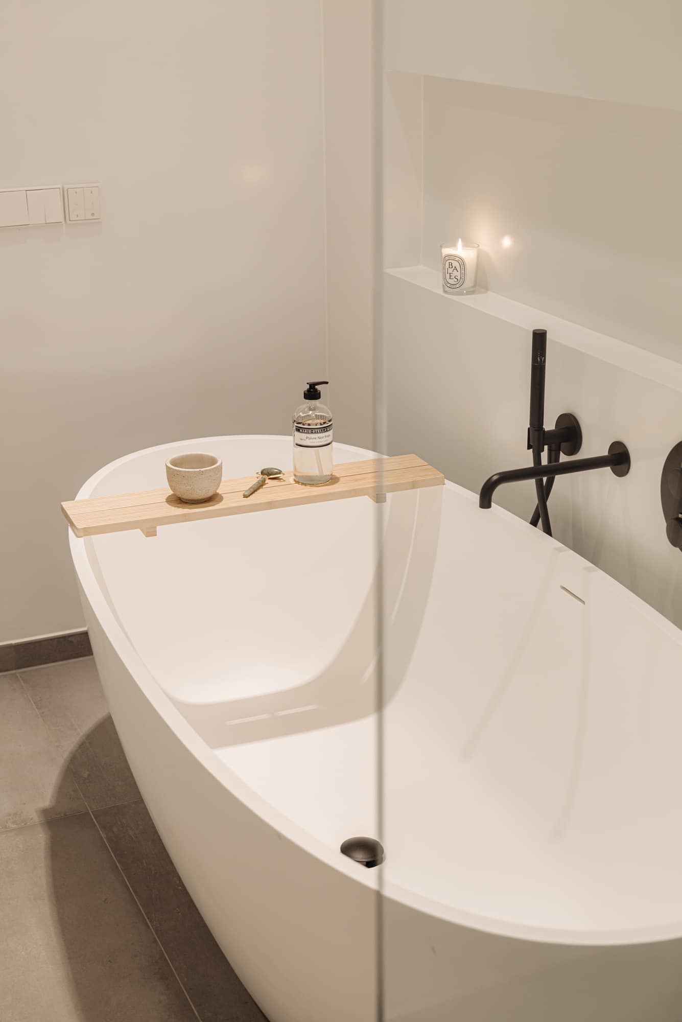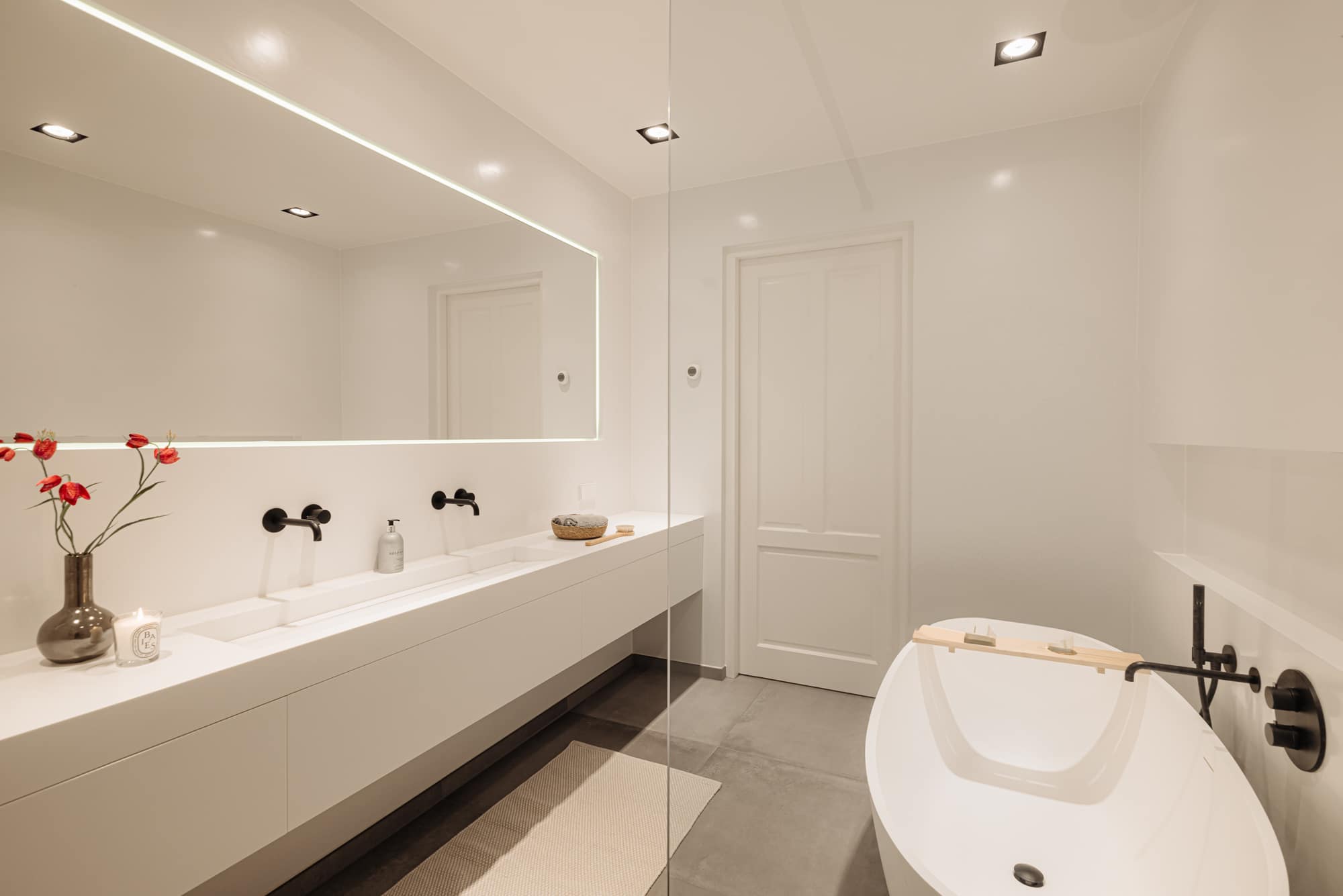 De luxe badkamer is stijlvol afgewerkt met een royale inloopdouche, ligbad en een op maat gemaakt wastafelmeubel met dubbele wastafel en verwarmde spiegel tegen condens. De badkamer is uitgevoerd in het duurzame Corian van Bdutch, wat een moderne uitstraling biedt.