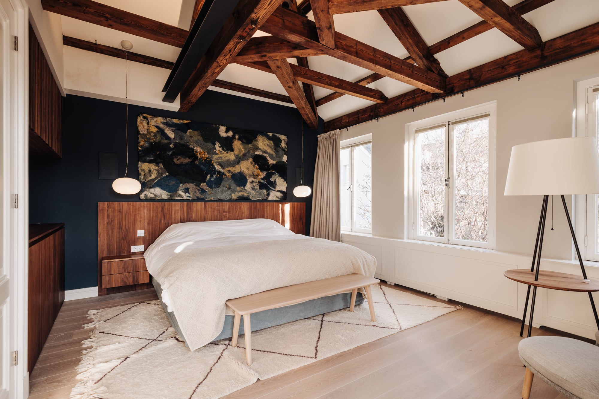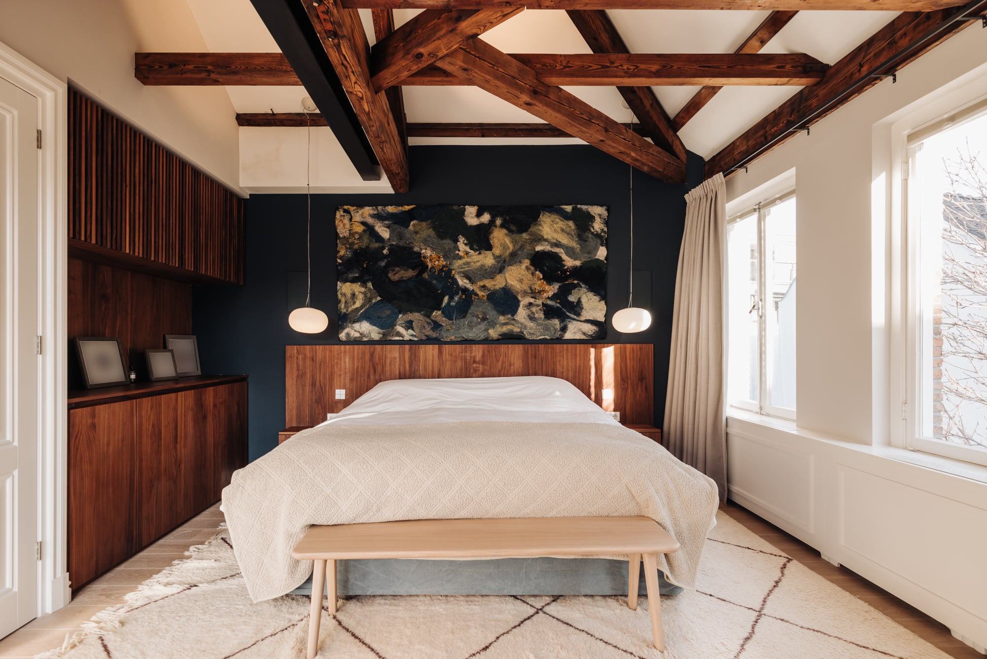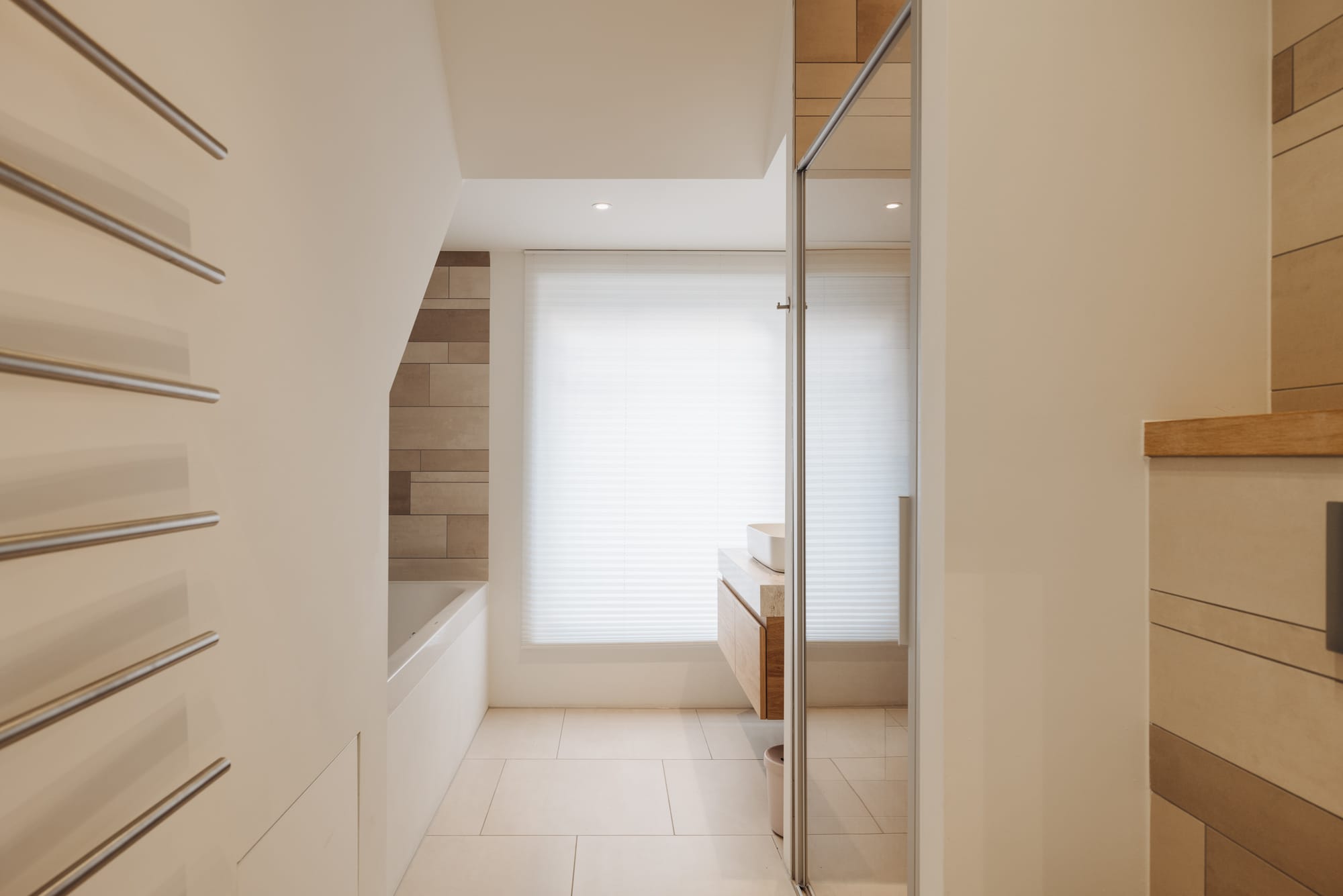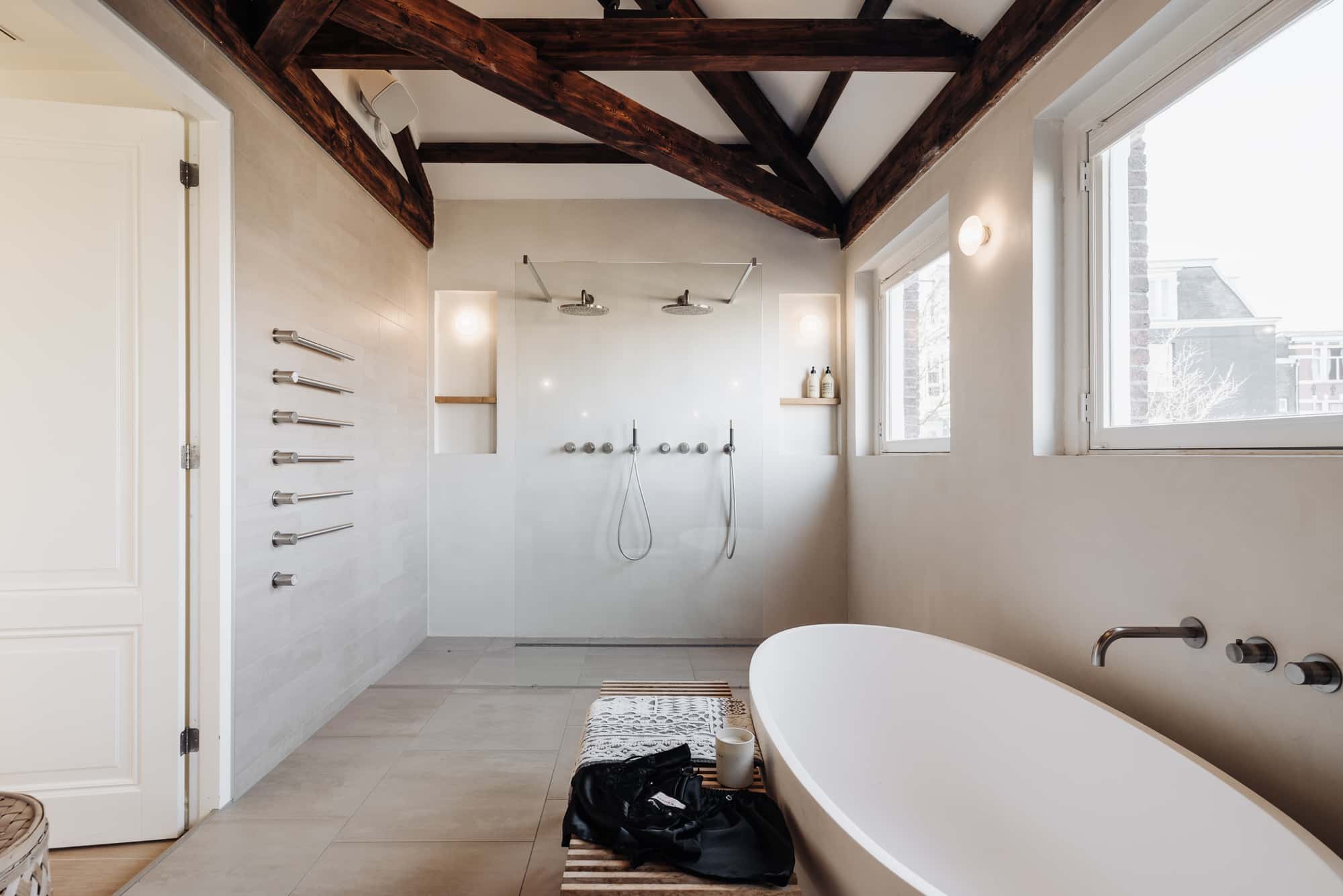 Opvallend is het trappenhuis van de eerste naar de tweede verdieping met een hoogte van 23ft. plafondhoogte en kroonluchter die als middelpunt dient. De overloop voelt meer als een bries tussen de slaapkamers met zijn uitgebreide plantenbak en open railsysteem. Er is zelfs een gezellige zitplek buiten op de overloop met uitzicht op de tuin. Alle drie de kamers op deze verdieping zijn voorzien van op maat gemaakte planken van vloer tot plafond en grote ramen. De kamer aan de voorzijde van het huis, momenteel in gebruik als kantoor, biedt een adembenemend uitzicht op de gracht door de grote raampartijen langs de muur. De middelste kamer kijkt uit op de gezellige boulevard en de kamer aan de achterzijde van de woning, ook compleet met plafondhoge ramen, komt uit op het magische tuinlandschap. Bovendien is de badkamer fijn ingedeeld en ontworpen met een apart bad en een douchecabine.